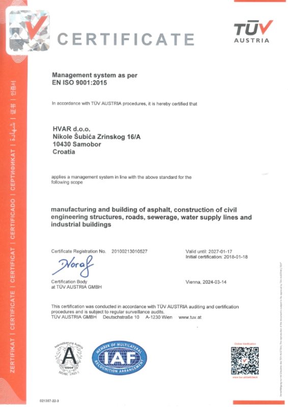 Certifikat susutava upravljanja kvalitetom prema normi EN ISO 9001:2015